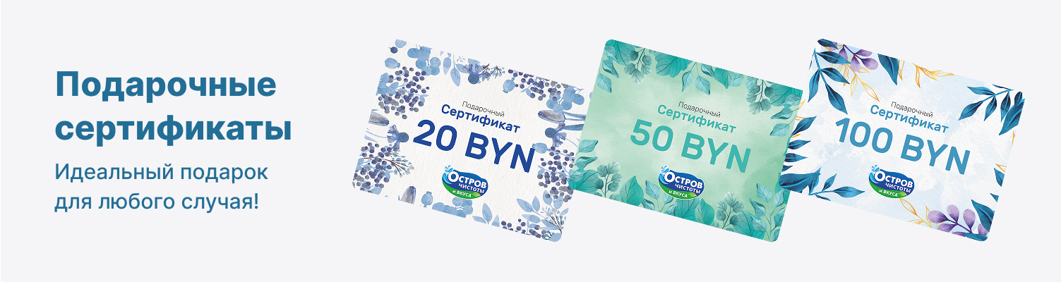 Подарочный сертификат от «Острова чистоты и вкуса» – это прекрасный подарок по любому случаю для любимых, друзей и коллег. Обладатели сертификата смогут выбрать то, что нужно именно им из огромного и разнообразнейшего ассортимента товаров для красоты, дома и отдыха!